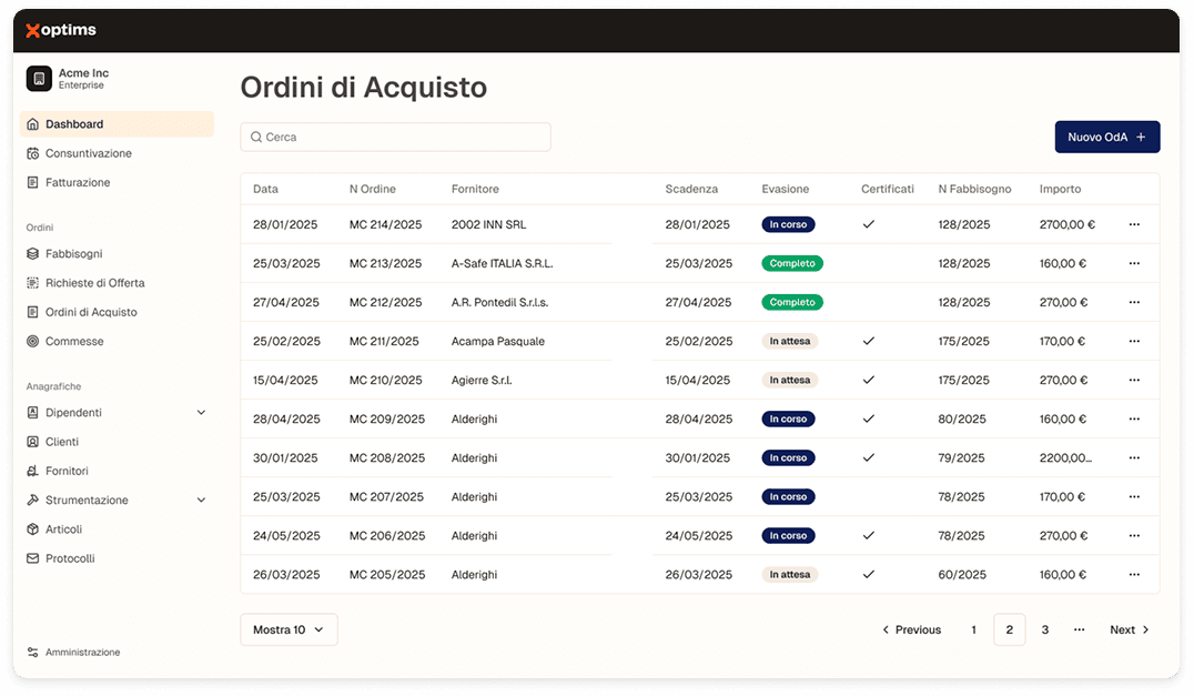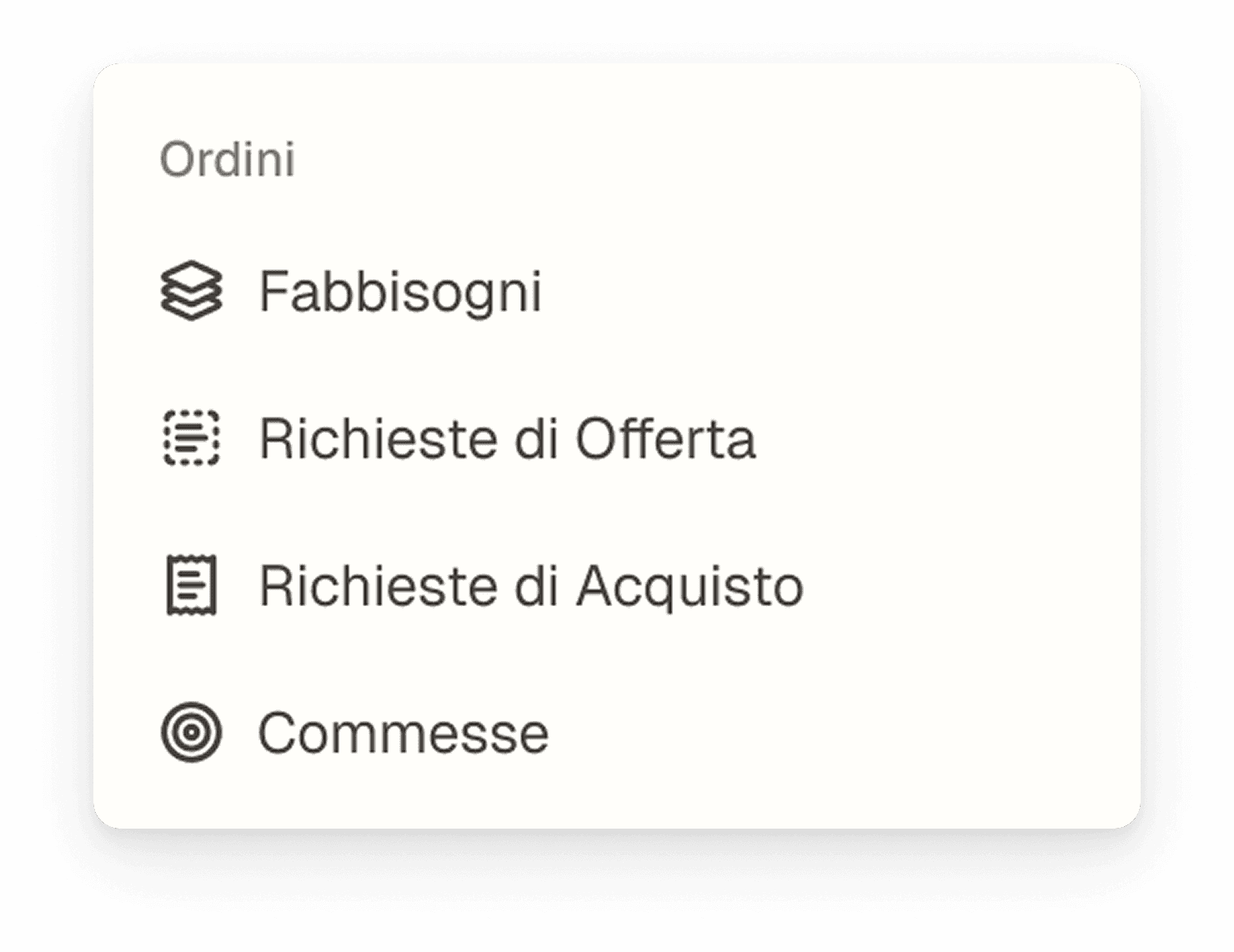 Un flusso continuo collega RdO, confronto offerte, ordini e consegne (con certificati), consuntivazione, budget e fatturazione.