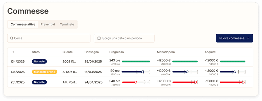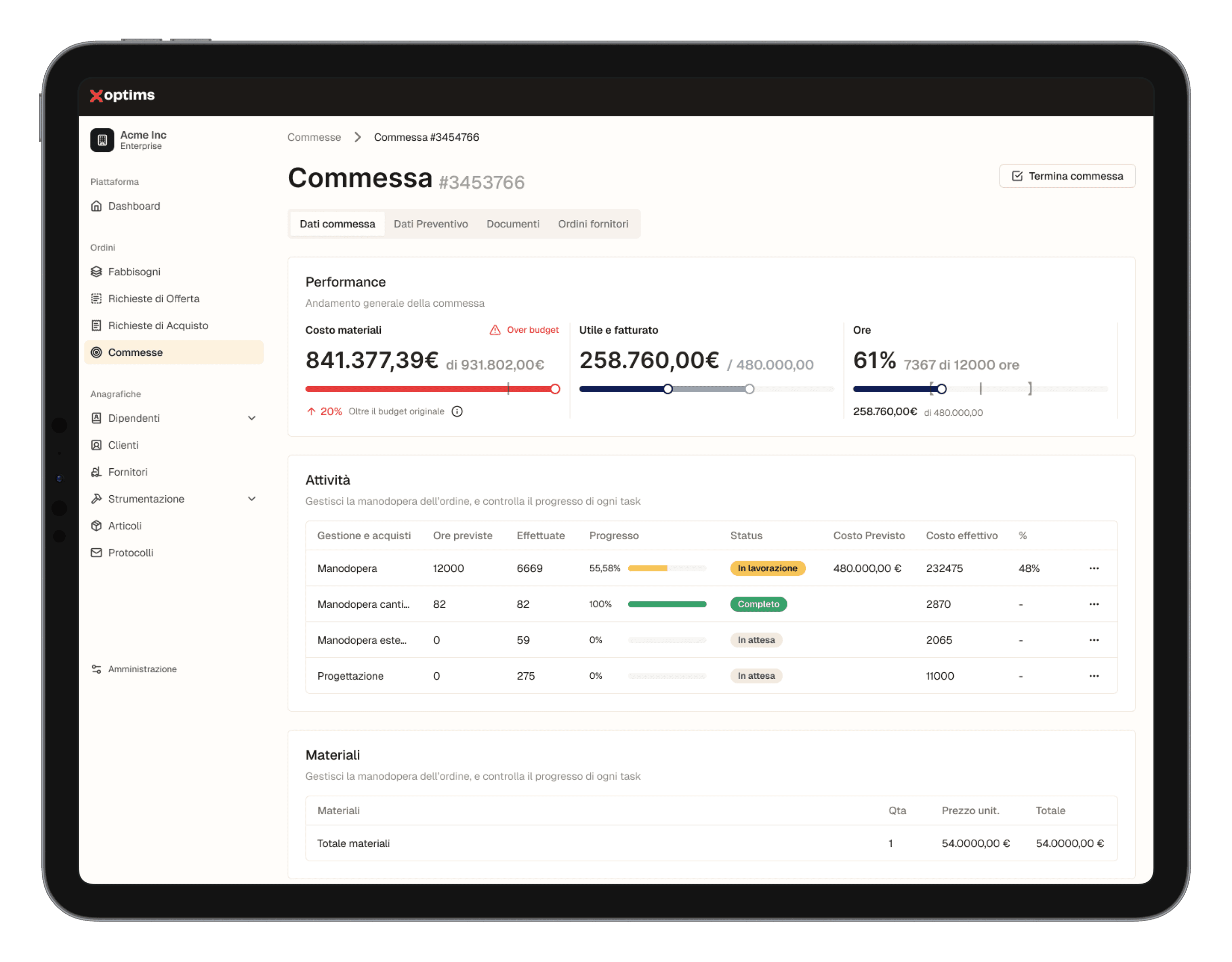 Ordini materiali e certificazioni sempre legati alla commessa.